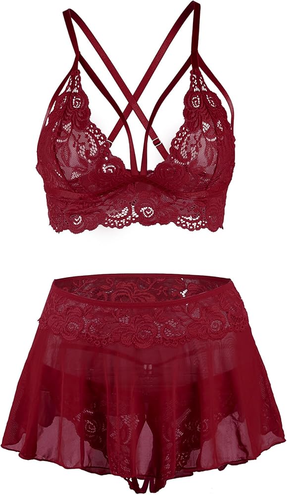 Women lace lingerie set features sheer lace cups with strappy detail, adjustable spaghetti straps, a hook back closure, a matching sexy lace miniskirt and a lace panty, spicing up your love.