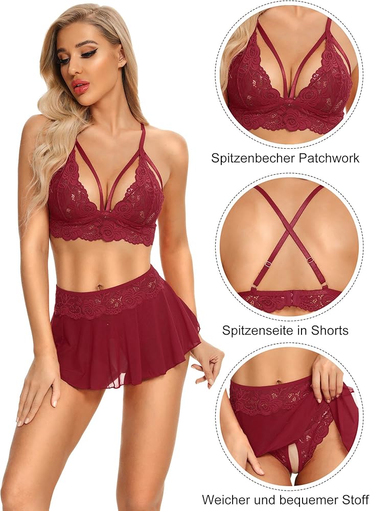 Style: Surprise your sweetie in this sexy 3 piece lingerie sets. Lace Bralette, Mini Skirt with G-String Sets, sexy skirt lingerie, 3 piece bodysuit, women in lingerie, lingerie for women, bra & skirt sets