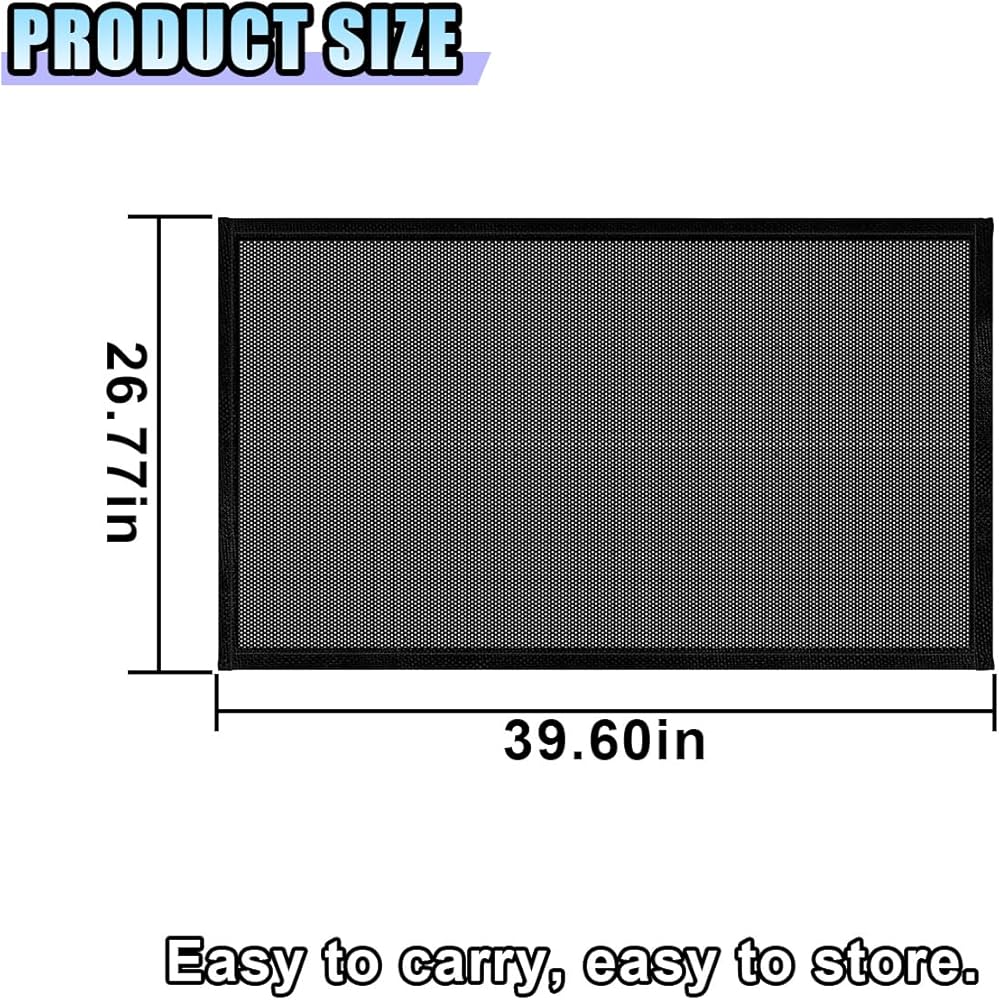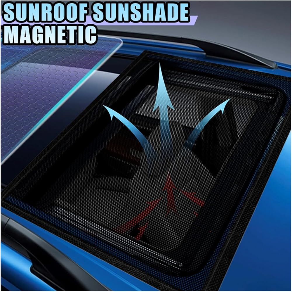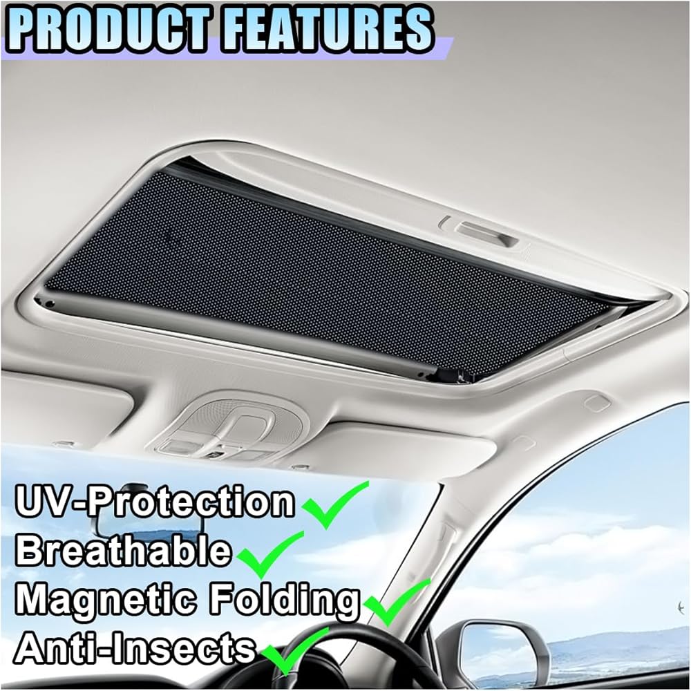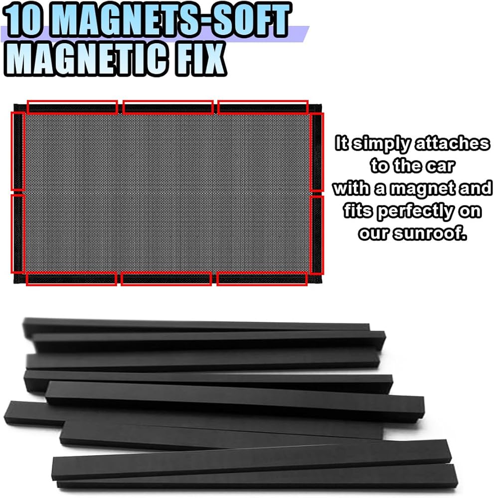 【High-Quality Material】: The car window shades are made of high-density polyester material, and its mesh is breathable, which can fully ensure air exchange inside the car. The magnetic strips sewn on the edges not only make installation and disassembly easy and convenient but also ensure that the sunshade fits tightly and stably to the sunroof, achieving the best effect.