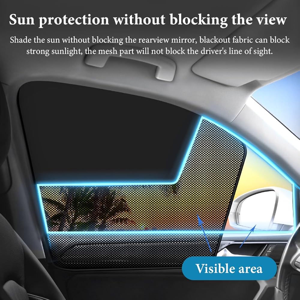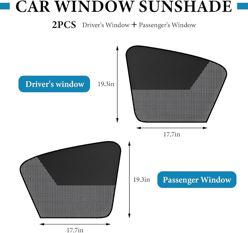 Sun Protection: The pair of sunshades effectively blocks intense sunlight, lowering the interior temperature for a cooler, more comfortable environment. They provide reliable UV protection for drivers and passengers and help protect against sunburn and discomfort on long trips