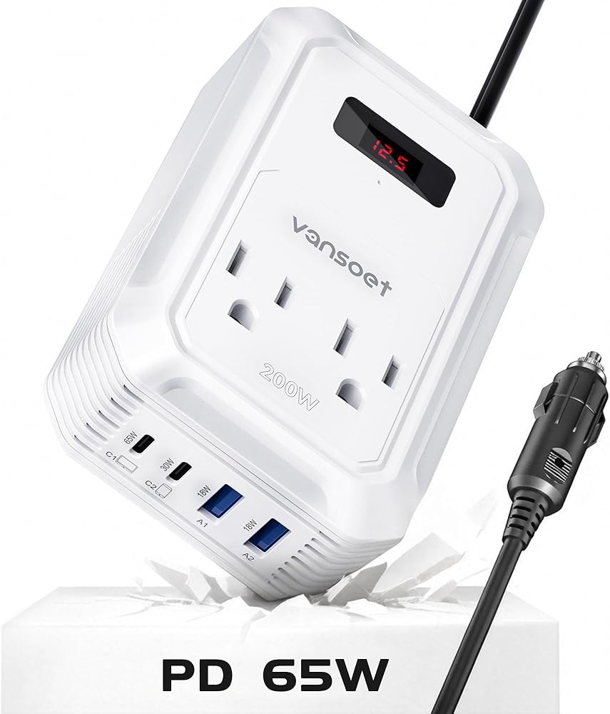 Vansoet Advantage: America's leading power inverter brand. Provides 200 Watts continuous DC 12v to AC 110v power inverter featuring 2xPD (65W/30W)&2xQC 18W USB ports, 2 AC outlets, and a 23.8-inch cable with cigarette lighter plug and LCD Display for you, more convenient.