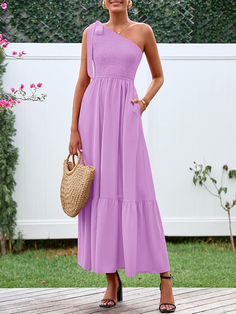 Design: This elegant one shoulder dresses for women features decorative tie,stretchy smocked bodice,and flowy tiered ruffled hem with functional pockets. The A-line cut lengthens your figure and accentuates your curves for an naturally feminine look