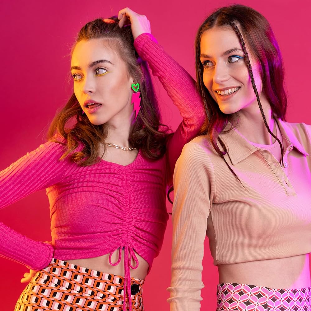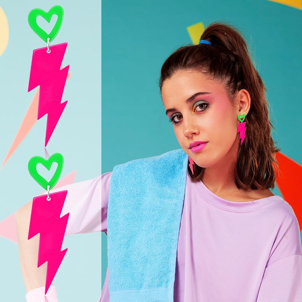 Step back into the 80s and 90s with these eye-catching neon earrings! Designed for women who love bold statement pieces, these glow earrings feature a unique mix of neon green, neon yellow, and hot pink in a retro lightning bolt and heart-shaped design. Perfect for any 80s party, Halloween, or neon dance night, these lightweight earrings ensure comfort while making you shine. Pair them with your neon 80s outfit for women and light up the dance floor with a fun, nostalgic touch!