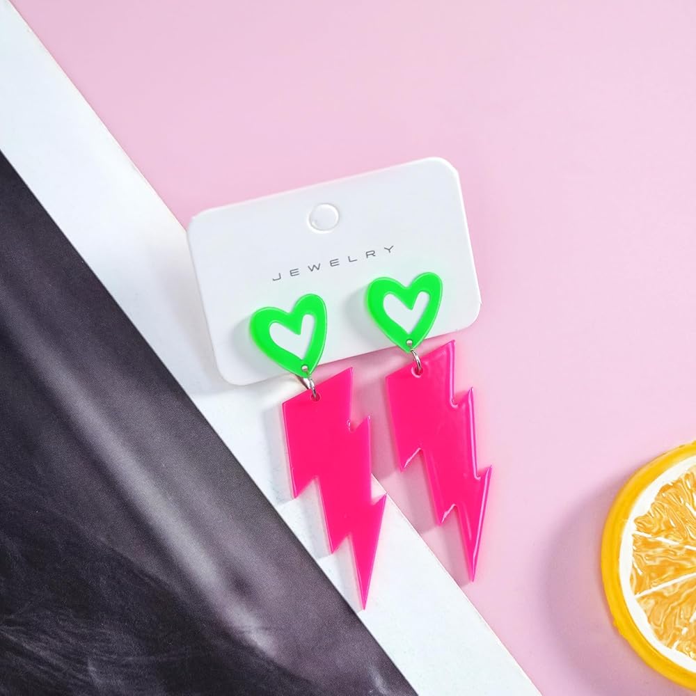Retro 80s Neon Earrings: Inspired by the bold and funky fashion of the 80s and 90s, these neon earrings feature a playful heart and lightning bolt design that captures the era's vibrant energy. The striking contrast between lime green and hot pink ensures you stand out at any party.