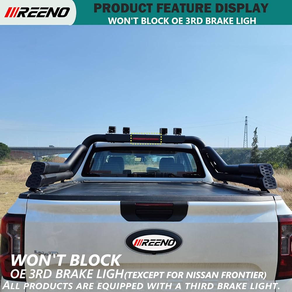 【DESIGN 】Roll Bar for truck is a versatile accessory designed for all your lighting needs,The design ensures compatibility and non-interference with factory 3rd brake lights. Light mount brackets for aftermarket LED light bars are provided (Lights NOT included).