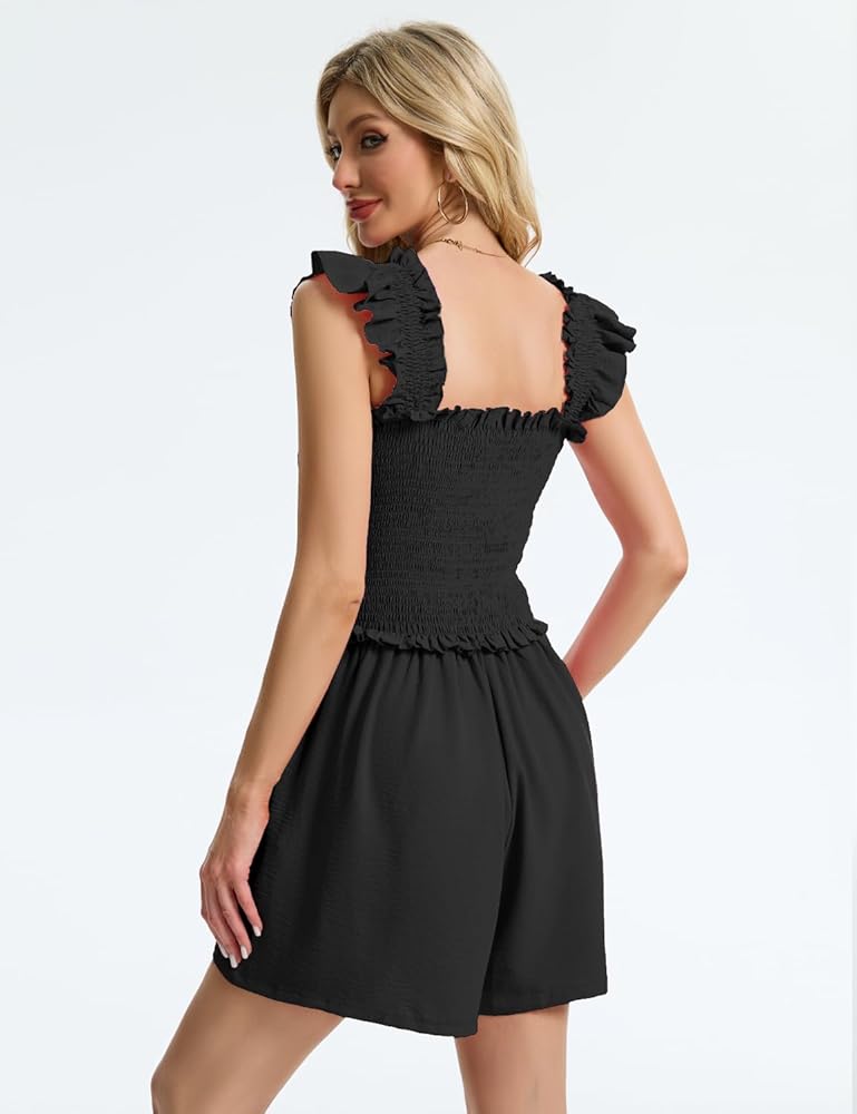 Design - This summer dressy romper is made of an elegant ruffle shoulder design,Smocked elastic bodice,square neck,sleeveless,open back shorts rompers,On-seam hip pockets,cute sweet style jumpsuit,ruffle rompers for women,fit and flare swing summer suits for women.
