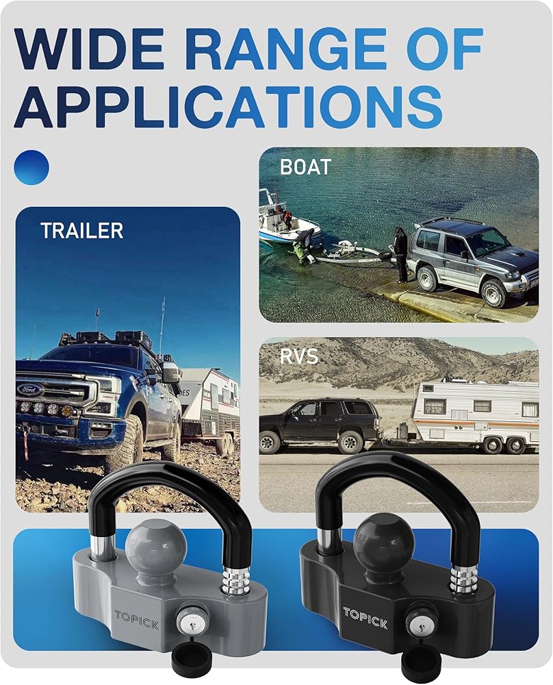 Quick & Tool-Free Installation: Ball hitch lock with effortless installation—simply adjust the U-shaped bolt, secure it over the trailer tongue coupler, and lock it in place. No additional tools required, allowing for quick and easy use