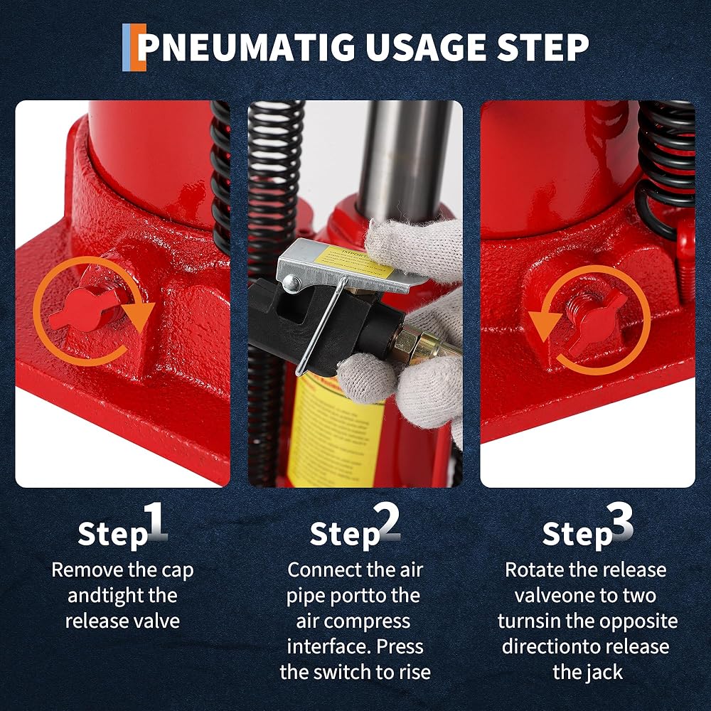 【Dual-Power Operation: Air-Powered OR Manual Pumping】 Switch between lightning-fast pneumatic mode (uses air compressor) and reliable manual mode (with dual handles) for ultimate flexibility. The only air/hydraulic bottle jack that works in garages, job sites, or remote locations!
