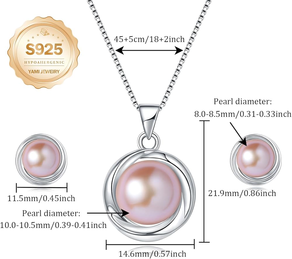 YAMI Freshwater Pearl Necklace and Earring Set for Women, 925 Sterling Silver 10MM Cultured Pearls Pendant Necklace Pearl Stud Earrings Jewelry Set, 18Inch+2" Box Chain, Gifts for Mother Wife Her