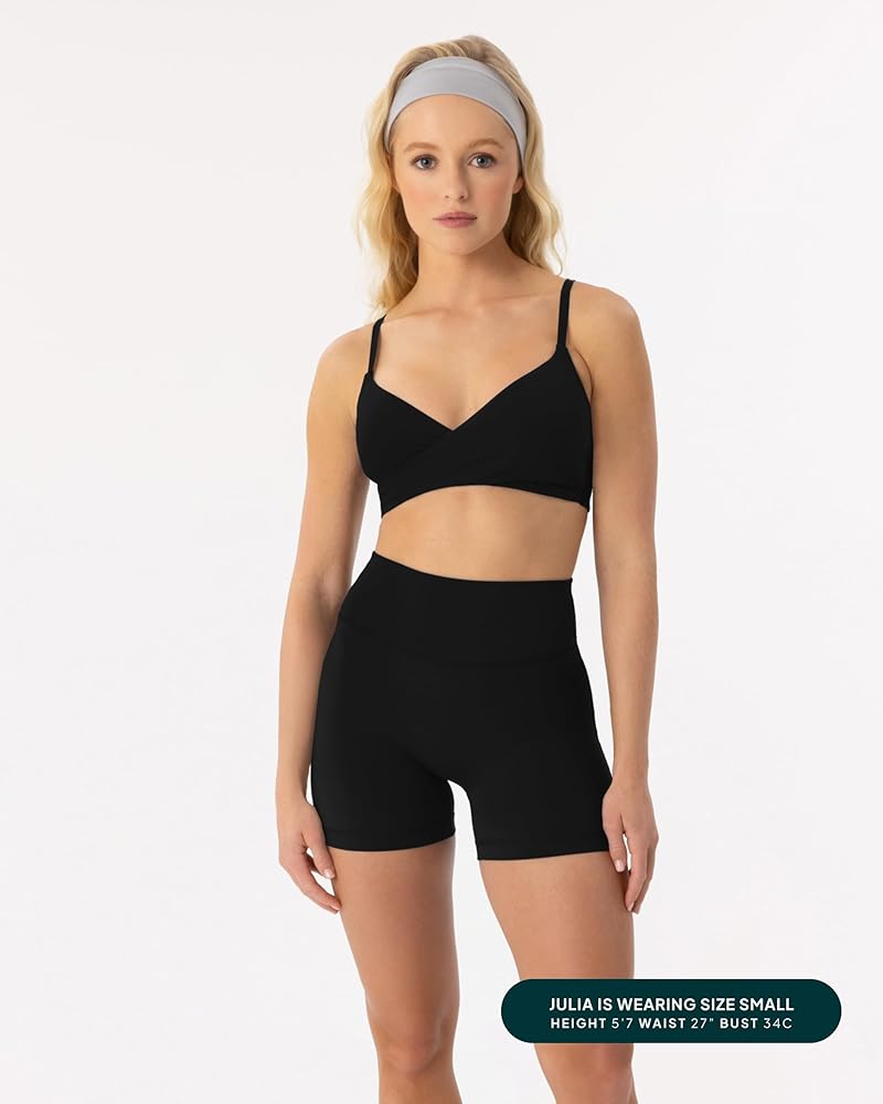 FEATURES: This buttery soft sports bra features 4-way stretch fabric that effectively wicks moisture and resists pilling. Our low cut sports bra for women features a flattering V-cut neckline with delicate spaghetti straps for a feminine silhouette that's both comfortable and stylish during any low-impact activity. The hidden elastic band provide secure support without digging into the skin.