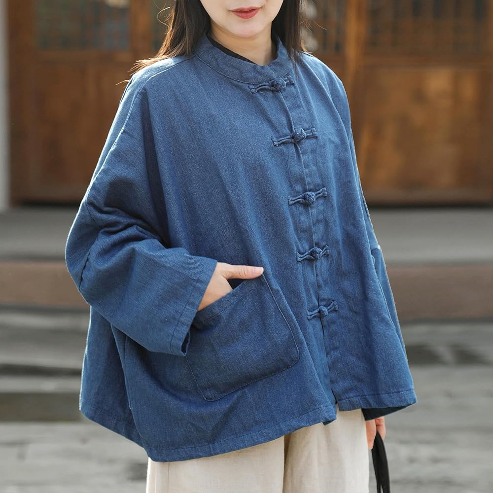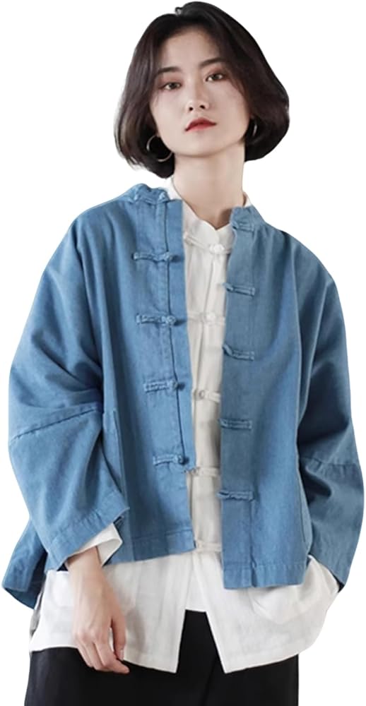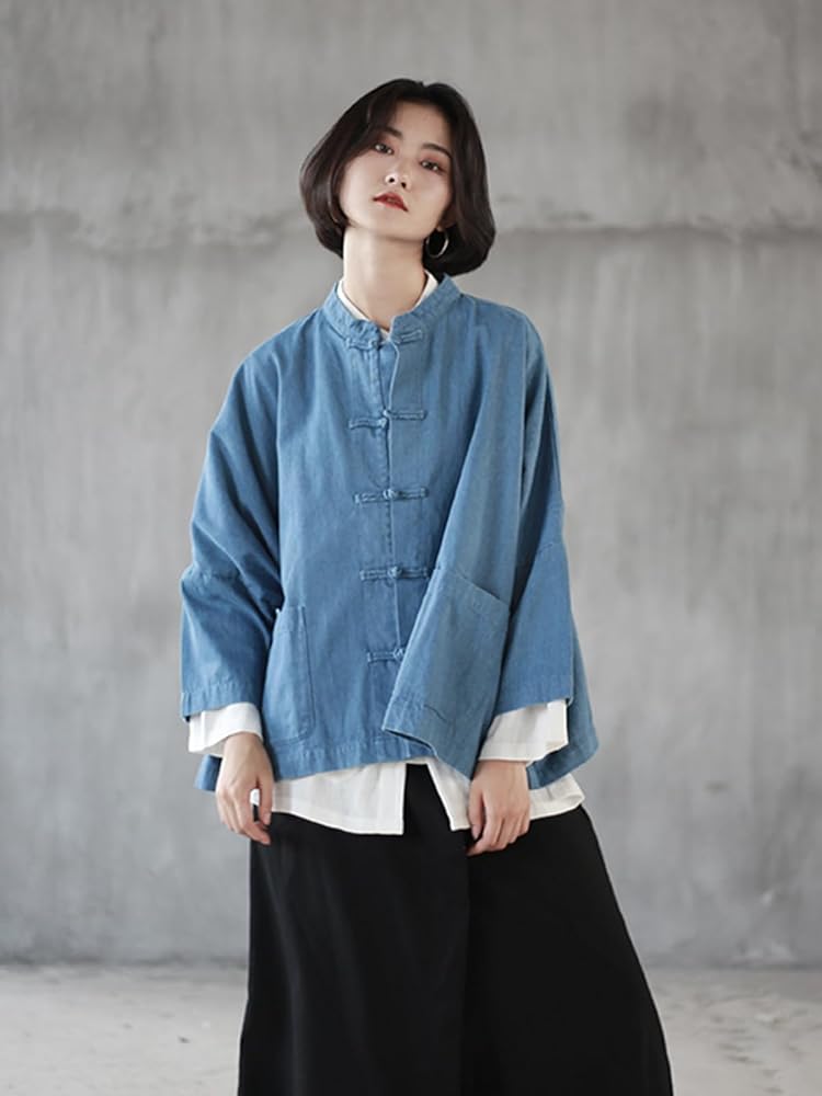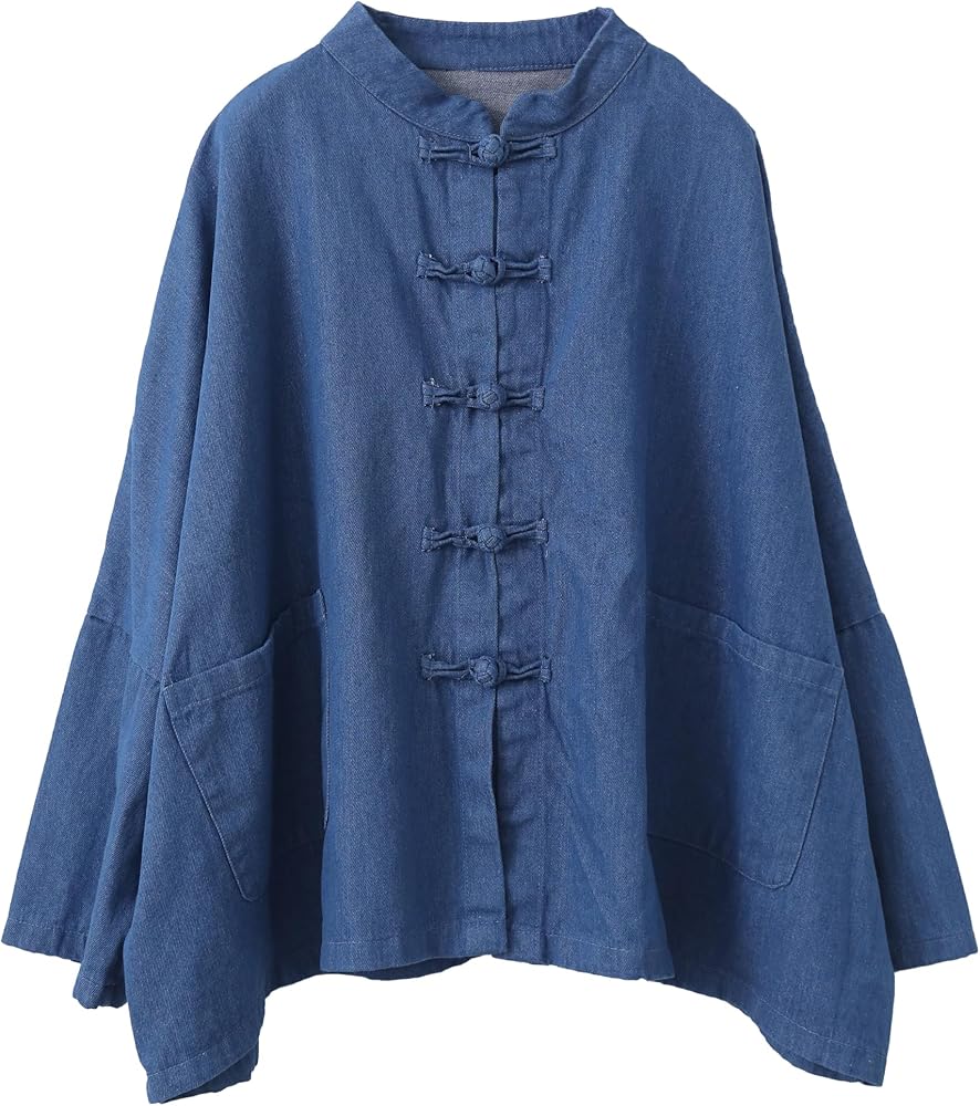 Fashion Design: This women's oversized denim jacket features cotton fabric, loose bat sleeves, a unique collar and button design, providing a comfortable wearing experience