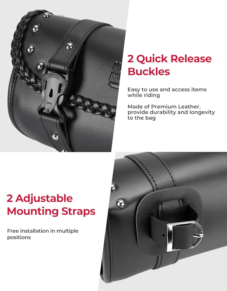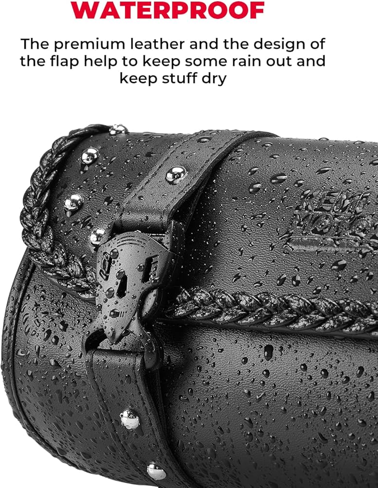 KEMIMOTO Motorcycle Tool Fork Bag PU Leather Universal Saddlebag for Front Fork Handlebar Sissybar Storage Pouch Motorcycle Roll Bag (Black Classic Buckle)