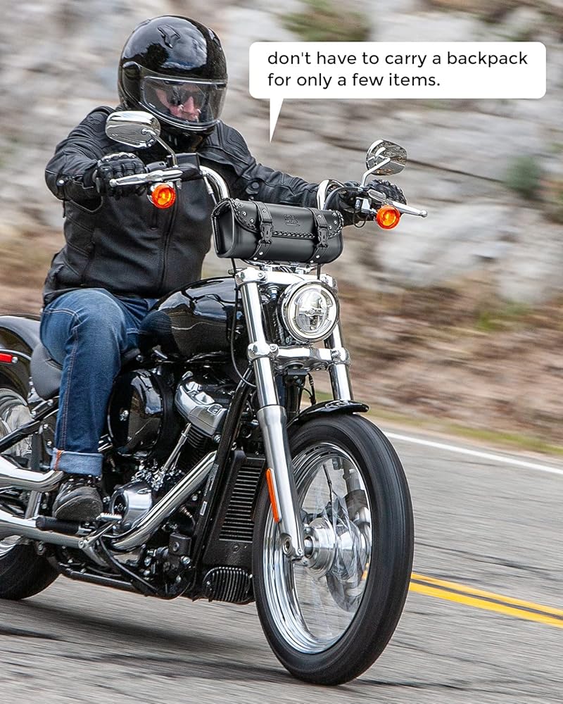【Enough Capacity】This premium leather motorcycle handlebar bag boasts superior stitching and heavy-duty buckles, with a spacious size of 11.4*4.7*4.1 inches. Perfect for carrying all your essential items, including keys, sunglasses, wallet, driver's license, and cell phone.