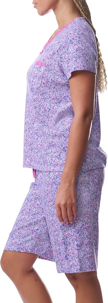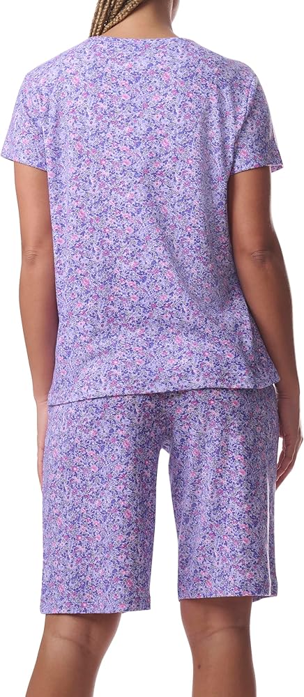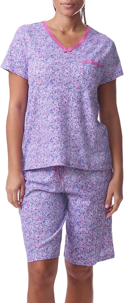 2-piece pajama set including a short-sleeve V-neck top and a bermuda short bottom - in an interlock knit fabric.
