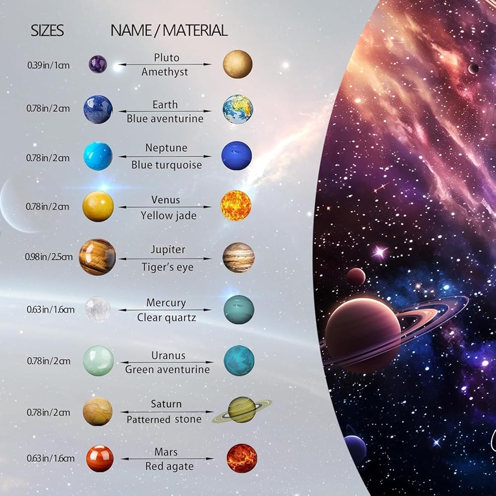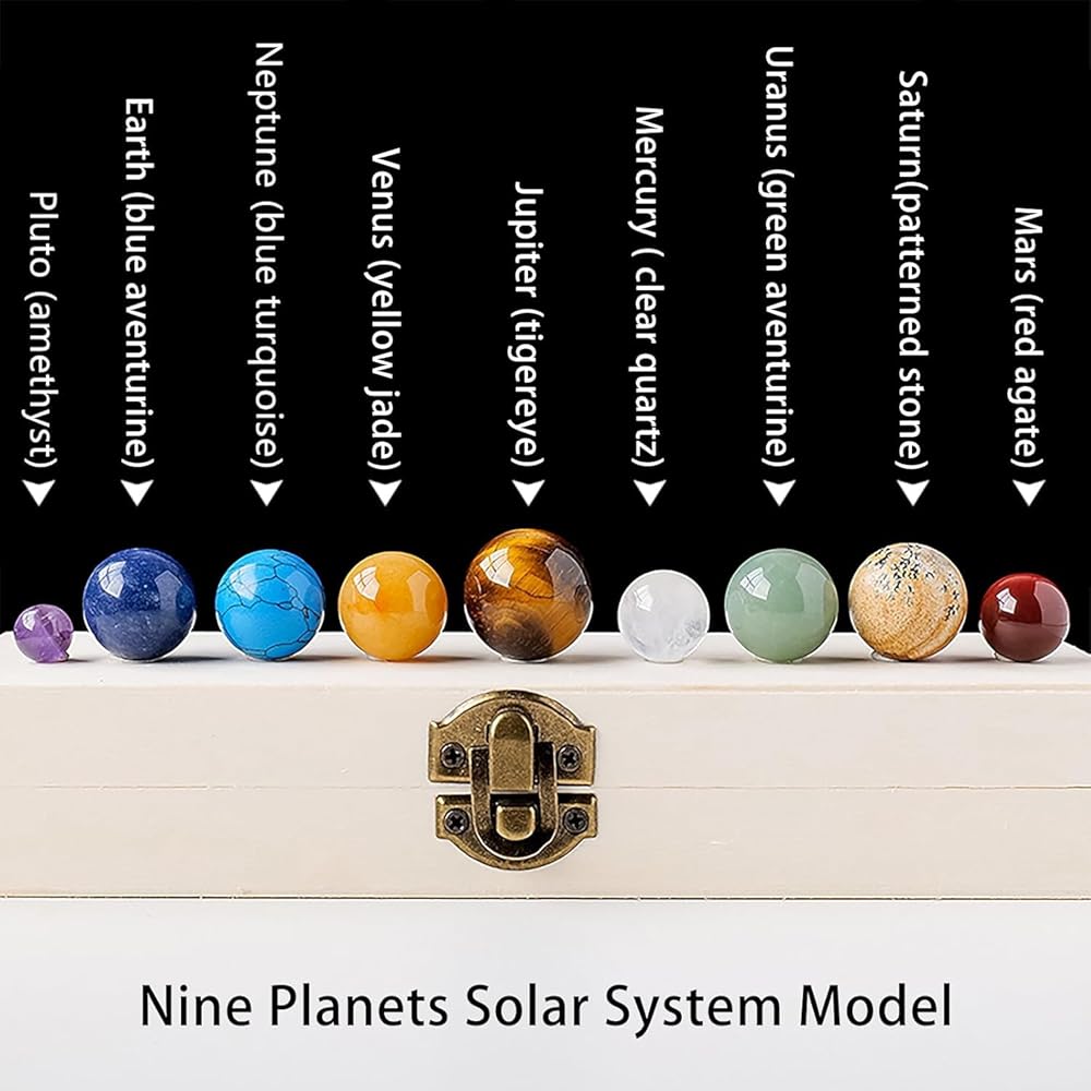 Authentic Gemstone Representation: Each planet is crafted from a specific gemstone, Pluto (amethyst), Earth (blue aventurine), Neptune (blue turquoise), Saturn (yellow jade), Venus (tiger's eye), Mercury ( clear quartz), Uranus (green aventurine), Jupiter (picture stone), Mars (red agate).