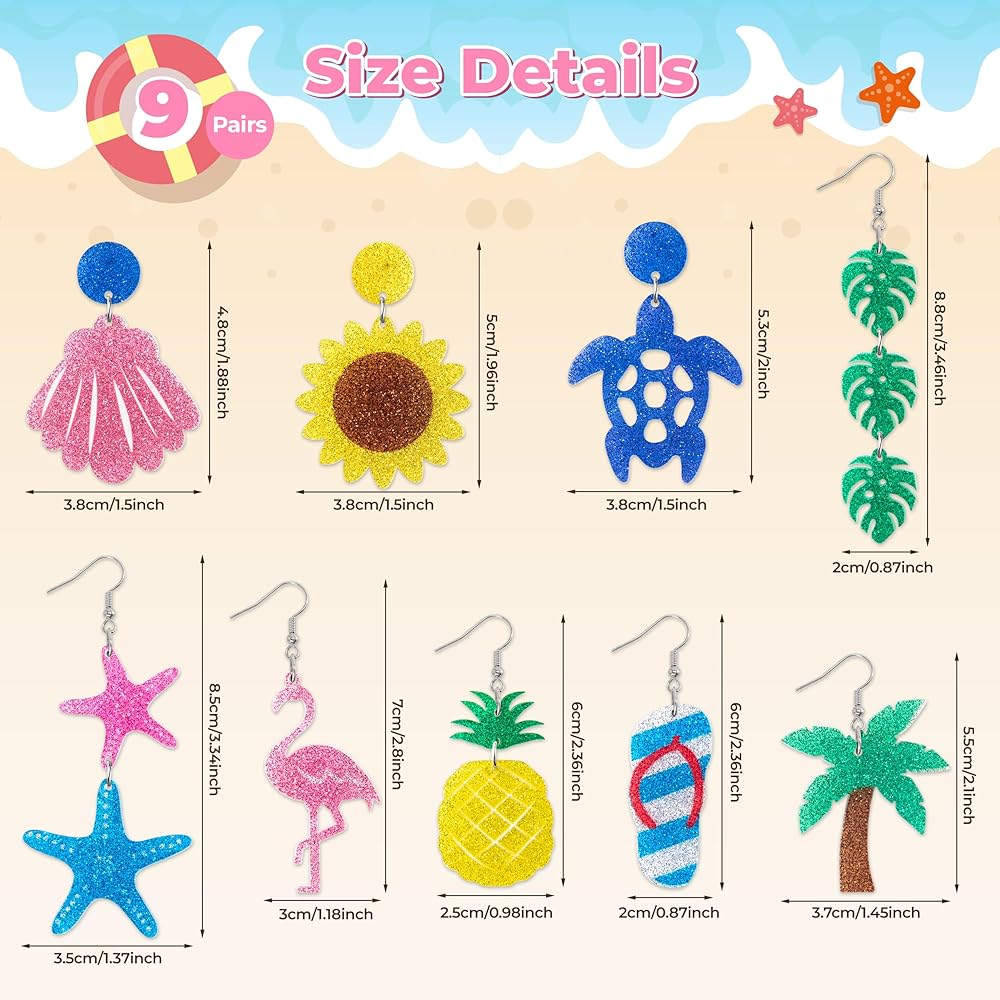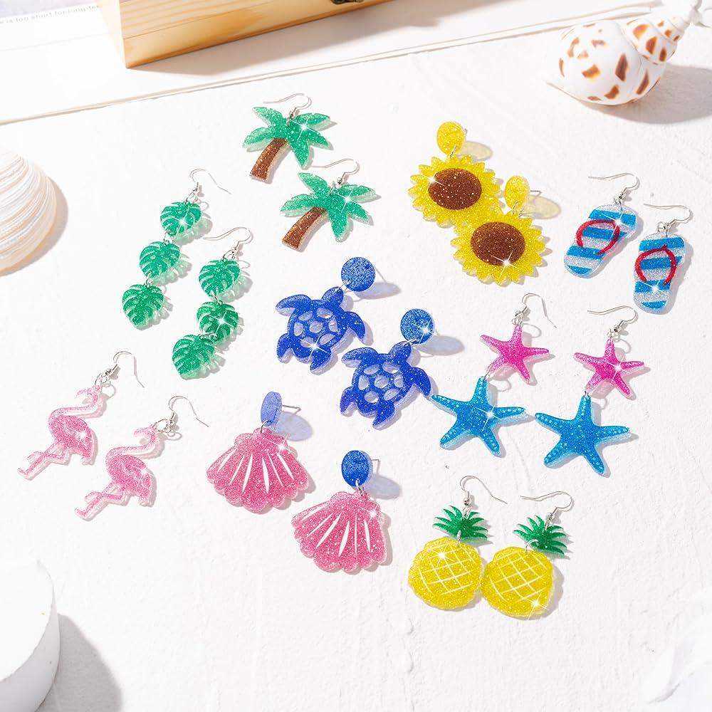 Summer Glitter Acrylic Earrings: Come with 9 Pairs of different trendy styles, coconut palm leaf, pineapple, sea turtle, starfish are included. Various patterns provide you with a variety of matching options, glitter design brings you a different visual experience, so that you look more charming and elegant in the crowd!