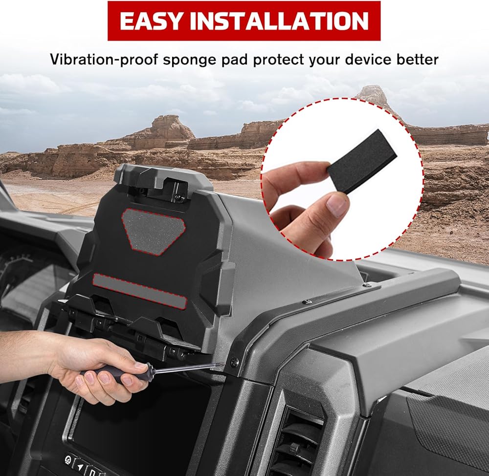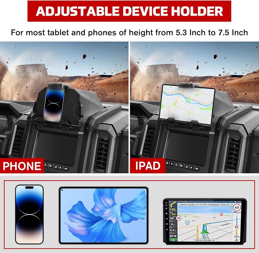Adjustable Mount: XUTVOTOR device holder is adjustable, it suits for most tablet, mobile phone, and navigator (5.1' to 10' ), which can hold your tablets and phones safety. The navigation holder is located above the UTV dashboard, so you can check your device more convenient