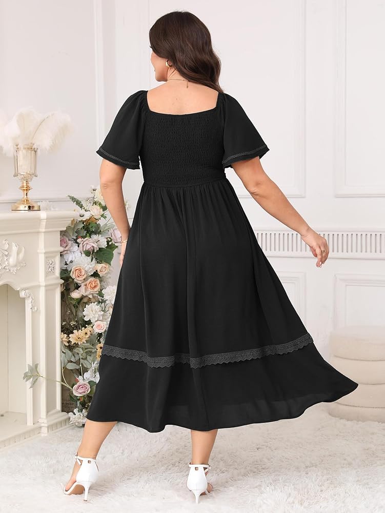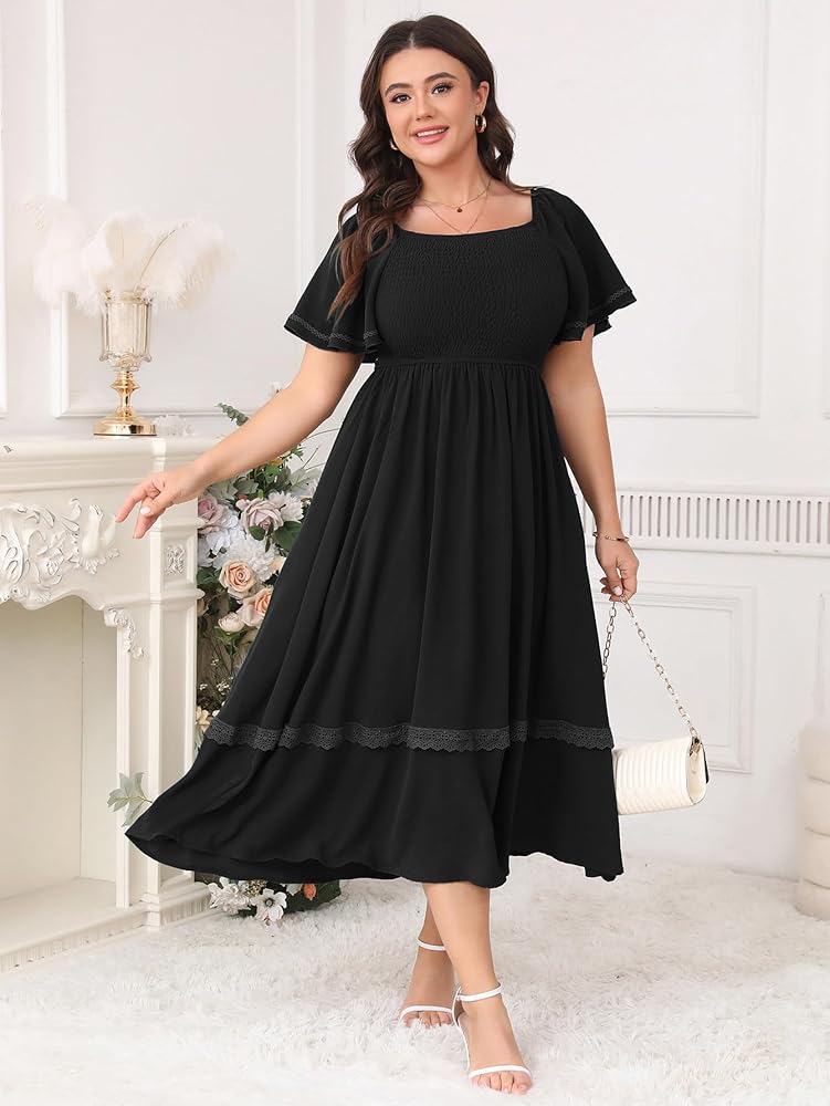 Classic Long Dress: This swing A-line cute dress with elastic smocked bodice ensures a cozy and flexible fit and accentuates your waistline in a great way. The flutter short sleeves can cover the arm well, which can be pulled down for a cute off-shoulder look. With its flattering square neck and lace trim design on the swing, this maxi dress combines boho-inspired elements with a modern, elegant twist
