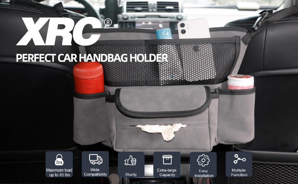 MULTI-FUNCTIONAL CAR HANDBAG HOLDER: XRC Quality car net pocket purse holder with 6 pockets for front seats - including handbag holder, tissue box holder, bottle holders and different size net pockets for your daily necessities. Strong weight-bearing capacity can hold well you hangbag/purse. Car handbag holder between the seats also a good barrier to prevent the kids or pets seating in the back seat from interfering with your driving. Neat your car and offer you a safe driving.