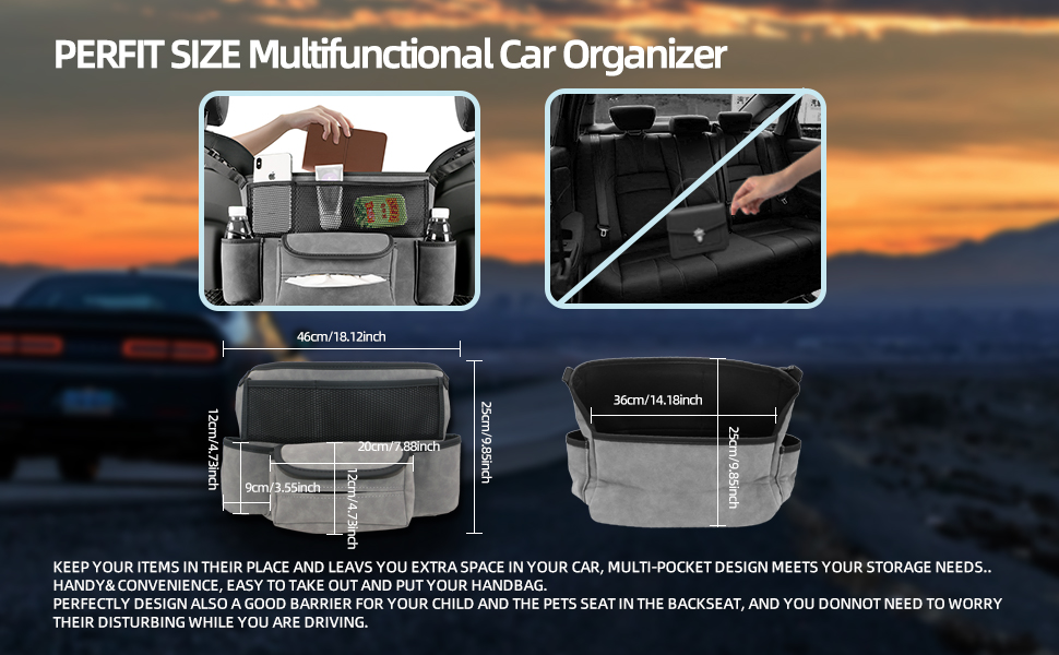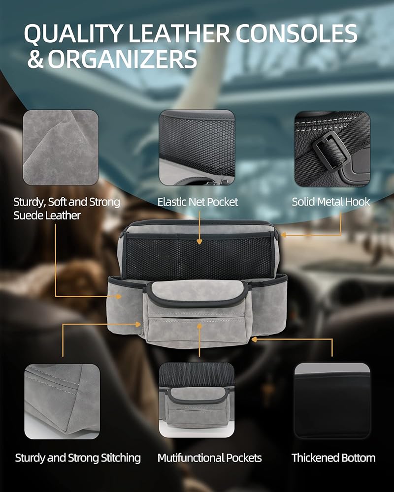 QUALITY LEATHER CONSOLES & ORGANIZERS: Made of sturdy, soft and strong suede leather, these car storage bags are non-toxic and without awful smell. With excellent stitching and the upgraded hard bottom, this hand bag holder can sturdy hold your handbag and other small items, really a great helper for your car.