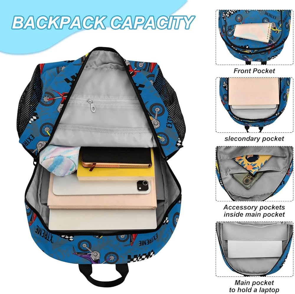 【Large Capacity】 Our school bags include 1 main bag, 1 front pocket and 2 sided pouch ; The main pocket contains a computer insert (up to 15.6 inches), an insert pocket and a small zipped pocket for ID, mobile phone, pens and other items. Double zip header and two-way opening design is more convenient to use. The front pocket is designed to store small things such as charging cables, pencil cases, wallets, keys and documents. The pockets on both sides can store water bottles and umbrellas.