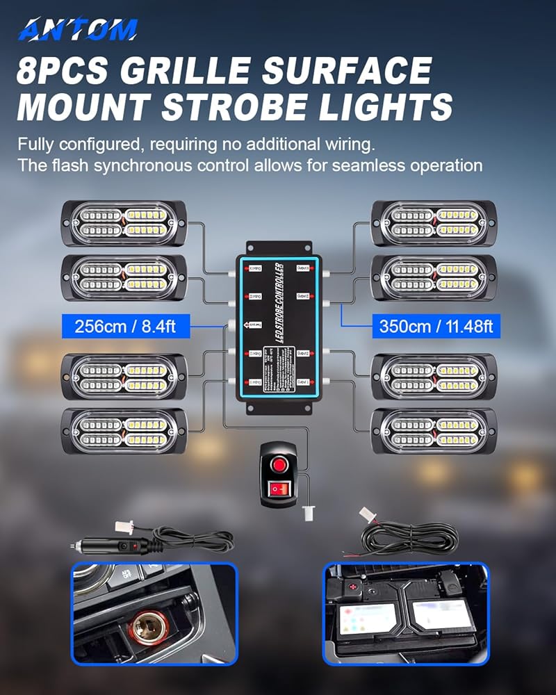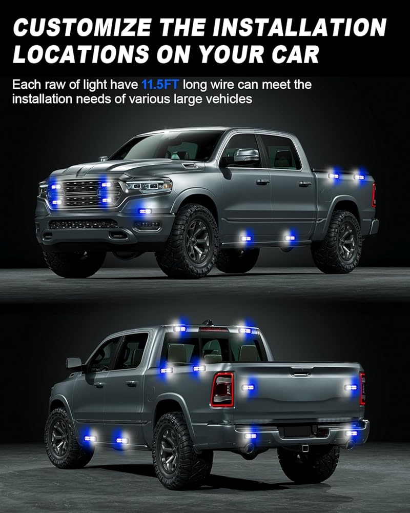 Easy to Install: Our emergency strobe lights with main control box for free wiring installation, each raw of light have 11.5FT long wire and rubber pad can meet the installation needs of various large vehicles