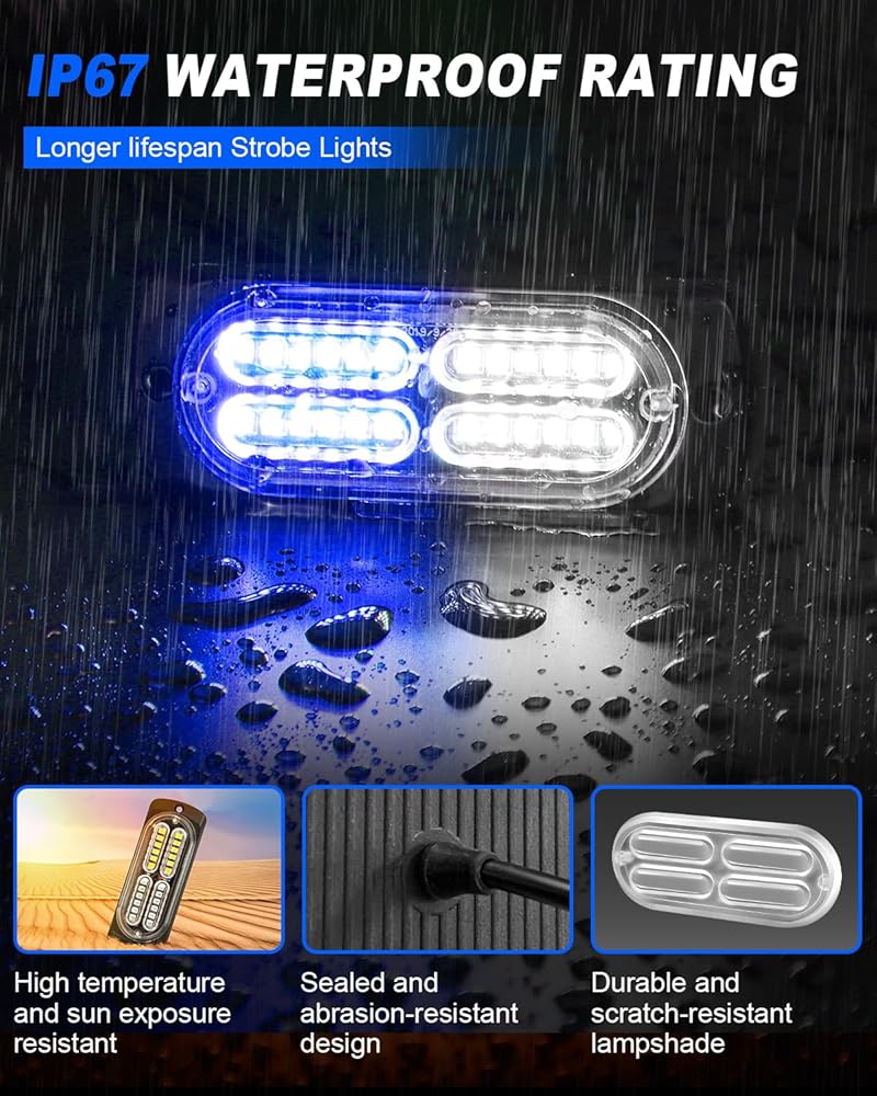 DURABLE AND WATERPROOF: Our LED strobe lights adopts aluminum alloy housing and heat sink design for better heat dissipation and long-time lasting. IP67 waterproof, stronger fog permeability, dustproof and anti-corrosion. Lifespan up to 50,000 Hours