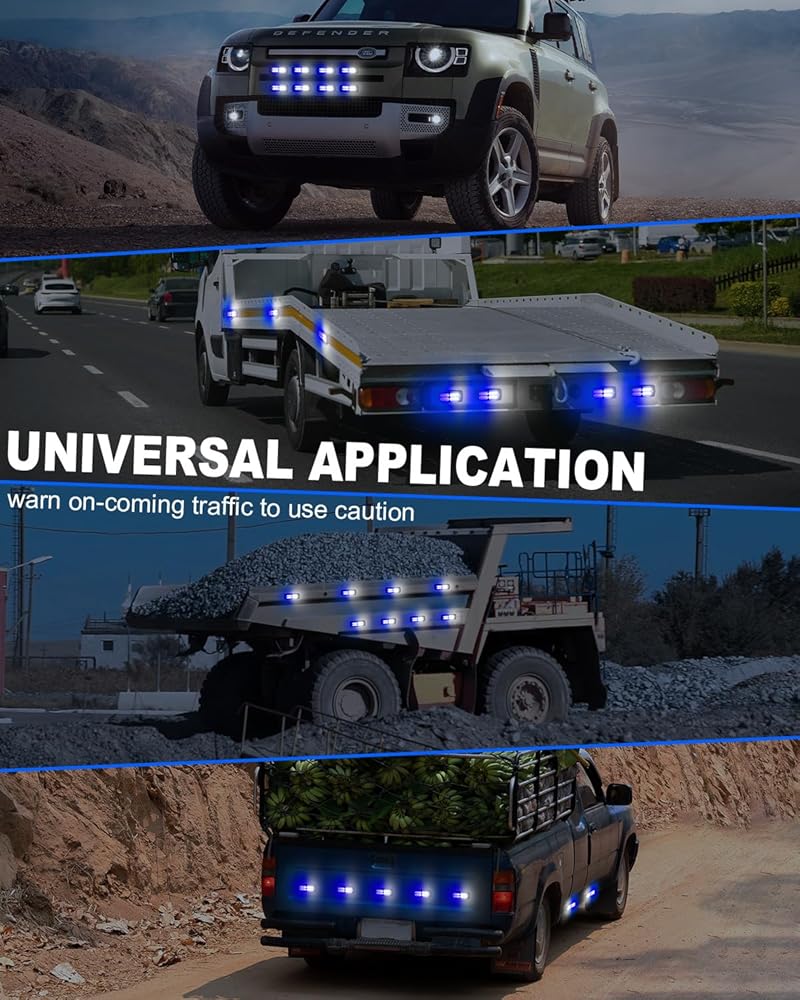 WIDELY APPLICATION: Car strobe lights with Ultra-thin design, it can be mounted on the side of truck or the grille in front of the 12-24V Vehicles, such as construction vehicles, tractors, snowplows, postal workers, city service workers, UTV, ATVs, SUVs, etc