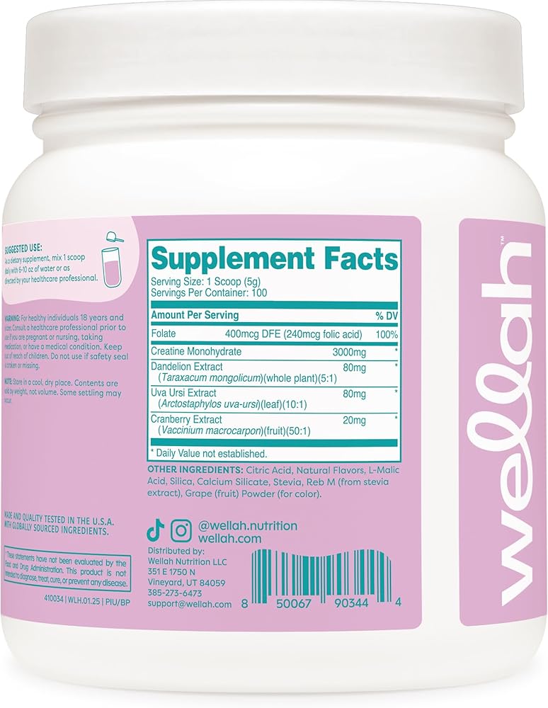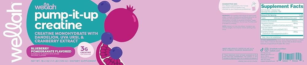 Wellah Pump-It-Up Creatine offers 100 servings of creatine monohydrate combined with a unique blend of dandelion, uva ursi, and cranberry extract. With no added flavors, it's a great addition to your routine. This product is manufactured in an NSF certified, GMP-compliant facility and is third-party tested for quality assurance.