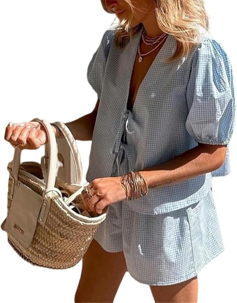 Features:This gingham set includes a tie front top and shorts.Feature cute short puff sleeve,v neck,elastic high waist,loose fit,wide leg.These design details give the 2 piece shorts set for women a standout piece for trendy look.