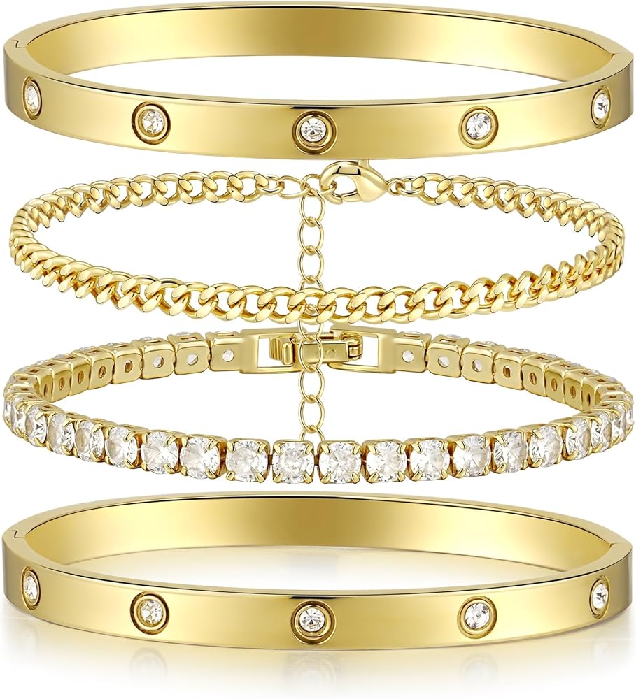 ELEGANT GOLD LOVE BANGLE BRACELET SET -- Versatile & Dazzling.A curated collection featuring two adjustable zirconia-studded love bangle bracelets, a timeless Cuban chain, and a full-zirconia tennis bracelet—each piece shines solo or layered for a radiant, luxe look.