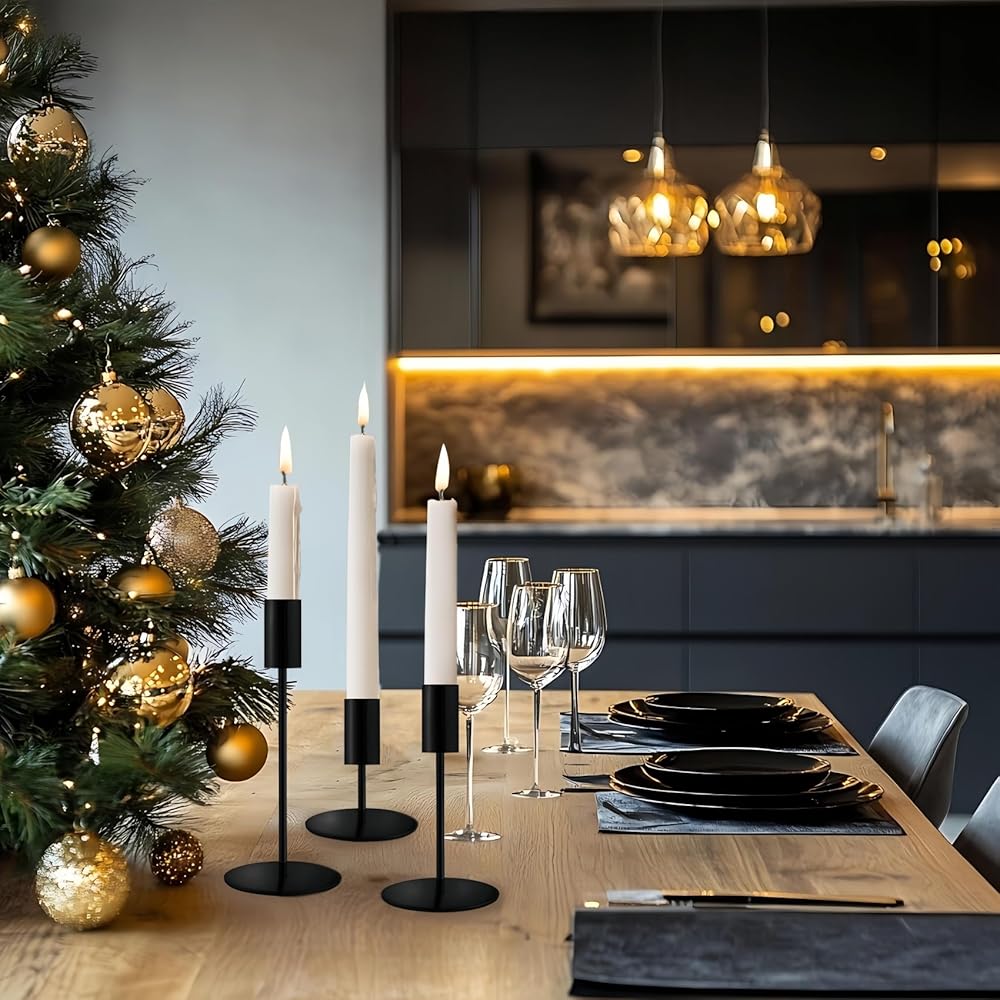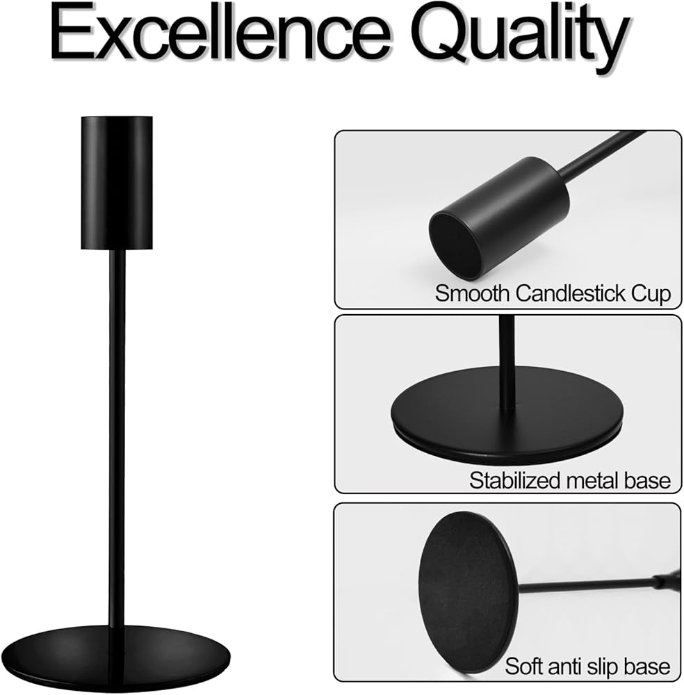 STABLE BASE: Tapered candlestick holders made of metal,, rust and corrosion resistant Each candlestick has a stable round base at the bottom, with a black non-slip pad on the bottom of the base for smooth placement, scratch and slip resistant to ensure long-lasting durability