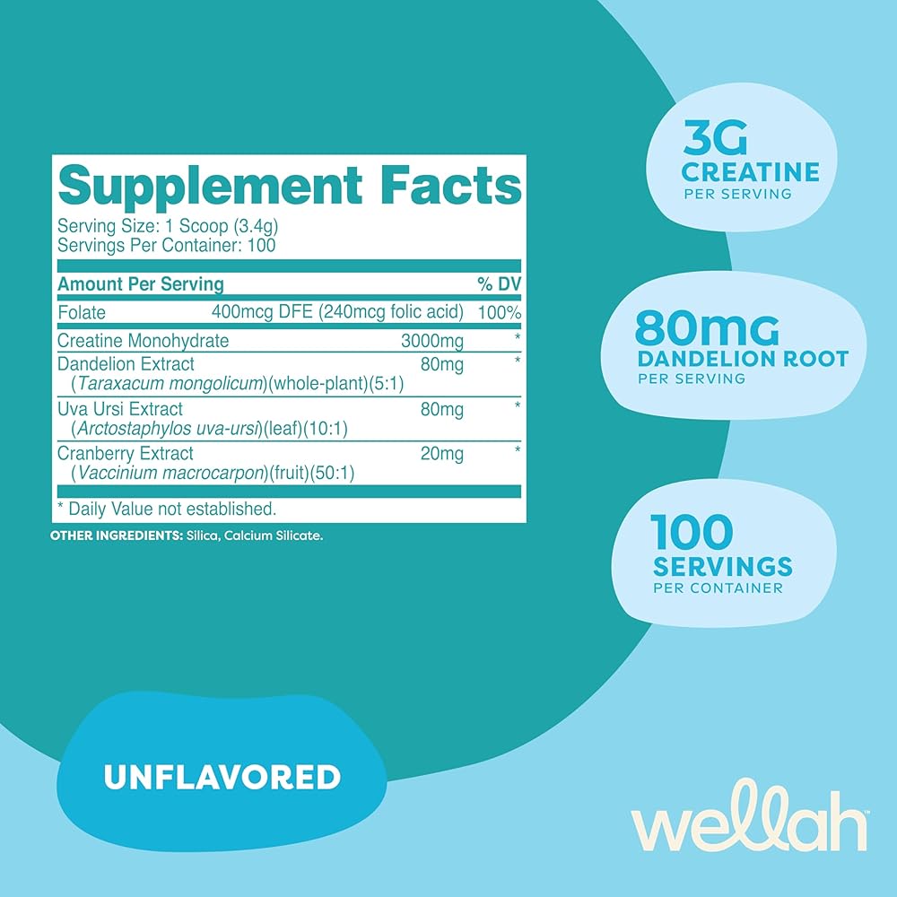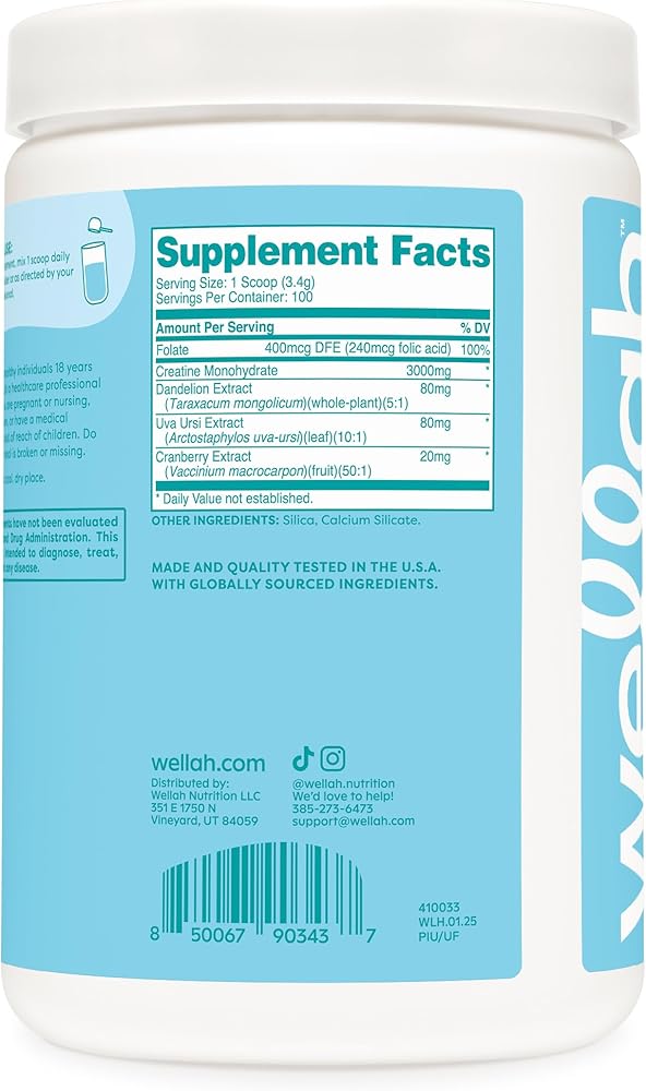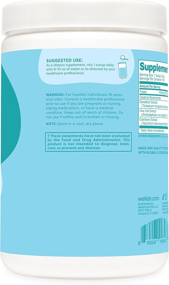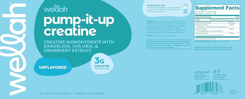 Wellah Pump-It-Up Creatine offers 100 servings of creatine monohydrate combined with a unique blend of dandelion, uva ursi, and cranberry extract. With a refreshing Blueberry Pomegranate flavor, it's a tasty addition to your routine. This product is manufactured in an NSF certified, GMP-compliant facility and is third-party tested for quality assurance.