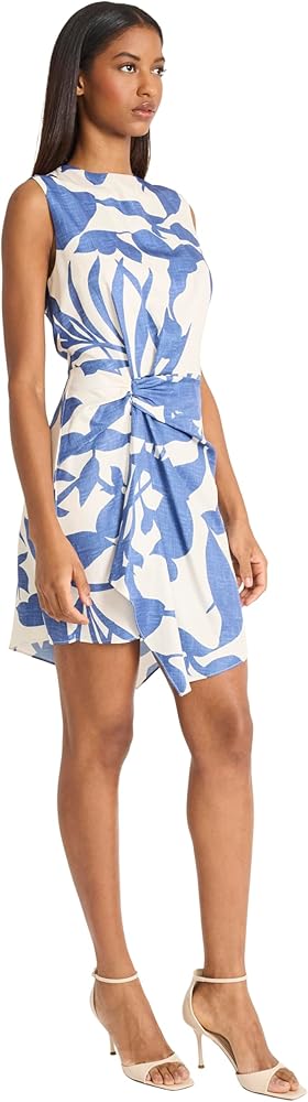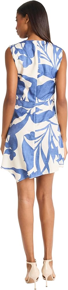 A chic mini featuring an asymmetrical hemline and sophisticated gathering at the waist, this stunning summer silhouette combines a fitted bodice with an elegantly draped skirt, floral elegance, and a contemporary structured design above the knee