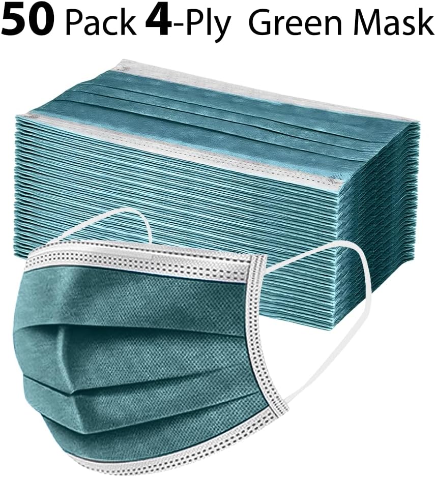 50 Pack 4-Ply Disposable Face Mask for Adults, Solid Green Breathable Earloop Full Face Protection for Women & Men