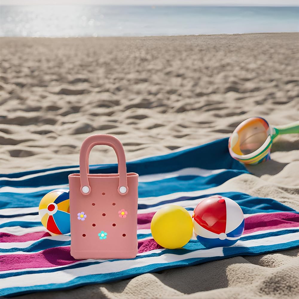 Cute Sized: Measuring at 6.5x8.0x3.1 inches, this small beach bag is elaborately crafted to ensure it's just the right size for your requirements. Compact and practical, the rubber tote bay effortlessly accommodates your snacks, little towel, toys, and more