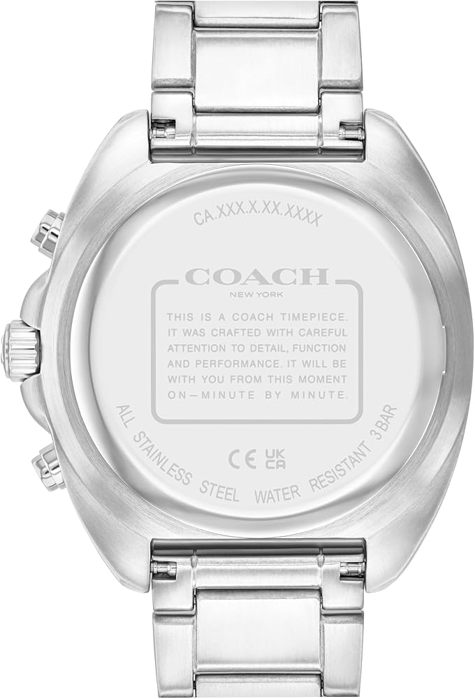 Caring for your timepiece: Your Coach watch has been developed with meticulous attention to quality, function and detail. A maintenance interval of 3 to 5 years is recommended, in addition to any required battery replacement. Never open the watch yourself.