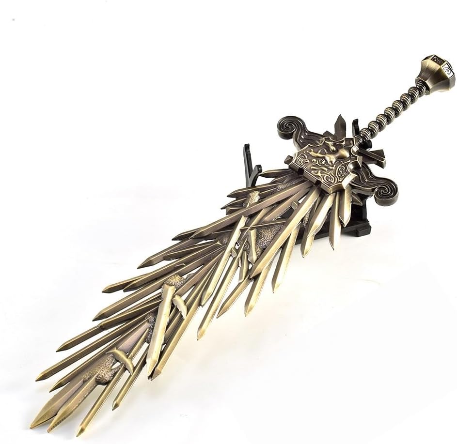 Step into the realm of fantasy with this exquisite collectible sword display piece inspired by legendary ring lore. The blade features a stunning blue-tinted finish with intricate leaf patterns etched along its length, creating an ethereal appearance that catches light beautifully. The antiqued bronze-colored hilt wrap provides a weathered, authentic look that complements the mystical design. This decorative sword comes with a sleek display stand, making it perfect for showcasing on mantels, shelves, or in collection cases. The detailed craftsmanship is evident in every aspect, from the precisely carved patterns to the balanced proportions. This piece serves as an impressive conversation starter and must-have for fantasy enthusiasts and collectors alike. Please note: This is a decorative display piece intended for collection purposes only.
