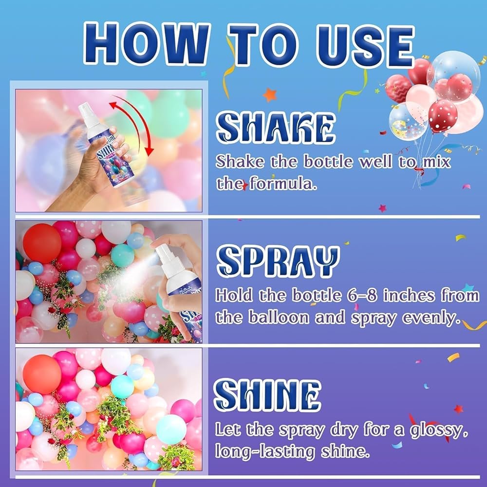 Instant Shine: Say goodbye to the hassle of wiping balloons and easily achieve a lasting shine. Simply spray and wait for 2 minutes, our balloon shine spray will make your balloons sparkle with dazzling brilliance! Use our balloon spray shine to experience ultimate shine and create a unique, unforgettable decoration experience!
