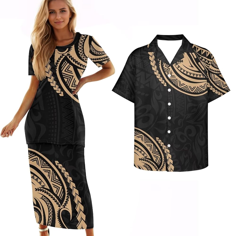 Design: Puletasi Samoan Traditional Tatau Pattern Style Design.O Neck Dress for Women,Beach Two Piece Set Dress.Short Sleeves Luau Beach Button Up Shirts for Men,Shirt With Cuban Collar and Straight Hemline.