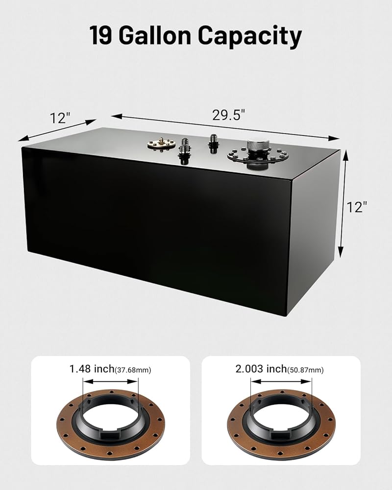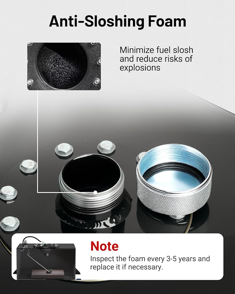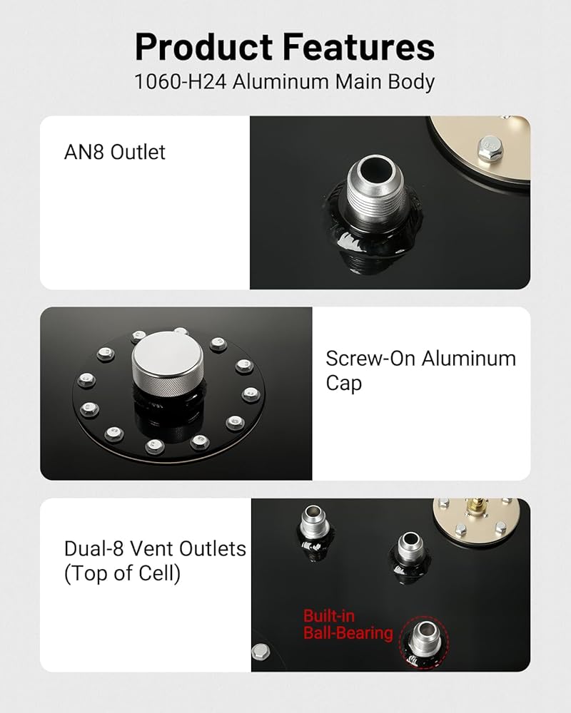 Material: The drift fuel cell is made of aluminum alloy 1060-H24 and the cover is made of plastic