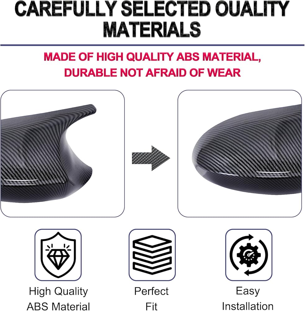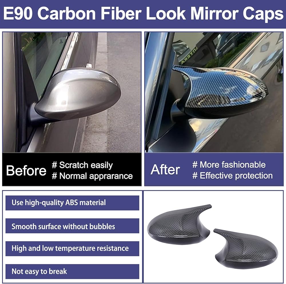 Carbon Fiber Surface Texture: This replacement for BMW E90 mirror caps are made of high quality ABS material with Carbon Fiber ( Not the Real carbon fiber). Finish surface texture protective films, abrasion resistant and not easy aging that ensure the strength and durability for long lasting usage