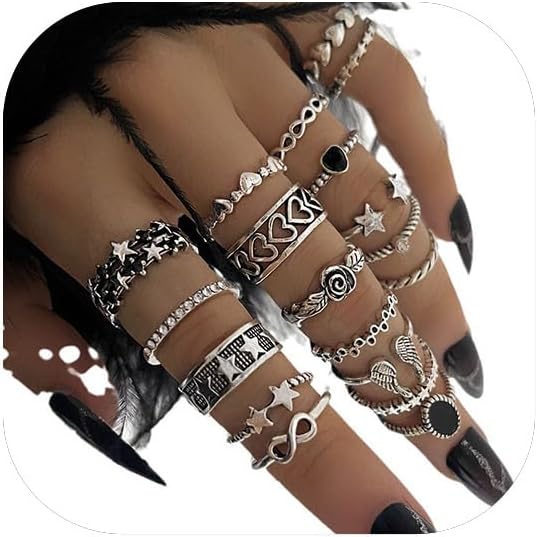 Transform your style with this edgy and versatile knuckle ring set that perfectly captures the essence of gothic punk and Y2K aesthetics. The set features an eye-catching combination of black and silver rings, including a striking snake design that adds a bold statement to your look. These stackable rings are designed to be worn across multiple fingers or layered together, letting you create unique combinations that match your mood. The vintage-inspired pieces blend boho and grunge elements, making them perfect for anyone who loves to express their alternative style. Each ring in this carefully curated set adds dimension to your jewelry collection, whether worn individually or combined for maximum impact. The versatile design allows you to mix and match these pieces with your existing accessories, creating endless possibilities for your personal style expression. These rings are more than just accessories - they're a statement of individuality that brings together gothic, punk, and bohemian influences in one cohesive collection.