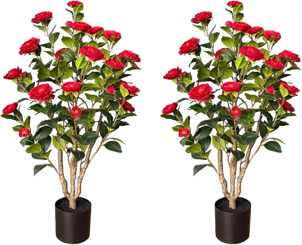2 Pack 39" Artificial Camellia Tree, 3.2 Ft Fake Camellia Plant with 28 Blooming Flowers, Artificial Plants in Pot for Home Front Door Christmas Indoor & Outdoor Decor (Red)