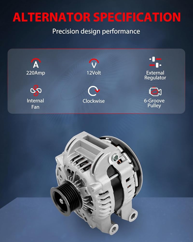 Alternators:220 Amp/12 Volt, CW, 6-Groove Decoupler Pulley, ED/IF, Bold all copper coil, Exquisite craftsmanship quality, silent power generation, durable and stable, stable current There is no abnormal sound