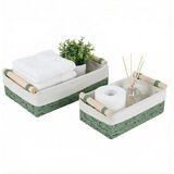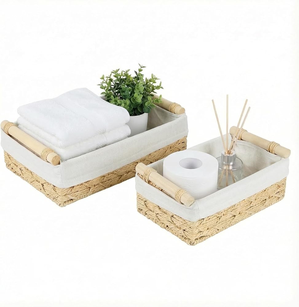 The bathroom storage basket set comes in two sizes, the larger (11.8*7.8*3.9in) can hold a lot of items to store toilet paper,toiletries,wipes,deodorant,candle,lotion,etc.The smaller (9.8*5.9*3.2in) still fits 3 large rolls of toilet paper or four towels.