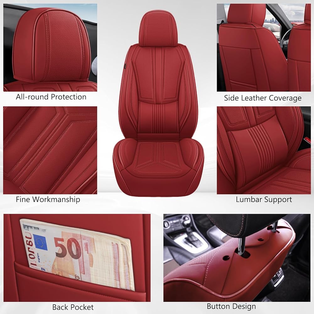 otoez Car Seat Covers Full Set, 5 Seats Nappa Leather Seat Cover for Car, Breatheable and Waterproof Seat Protector Full Coverage, Universal Automotive Seat Cushion for SUV Truck Seden, Red