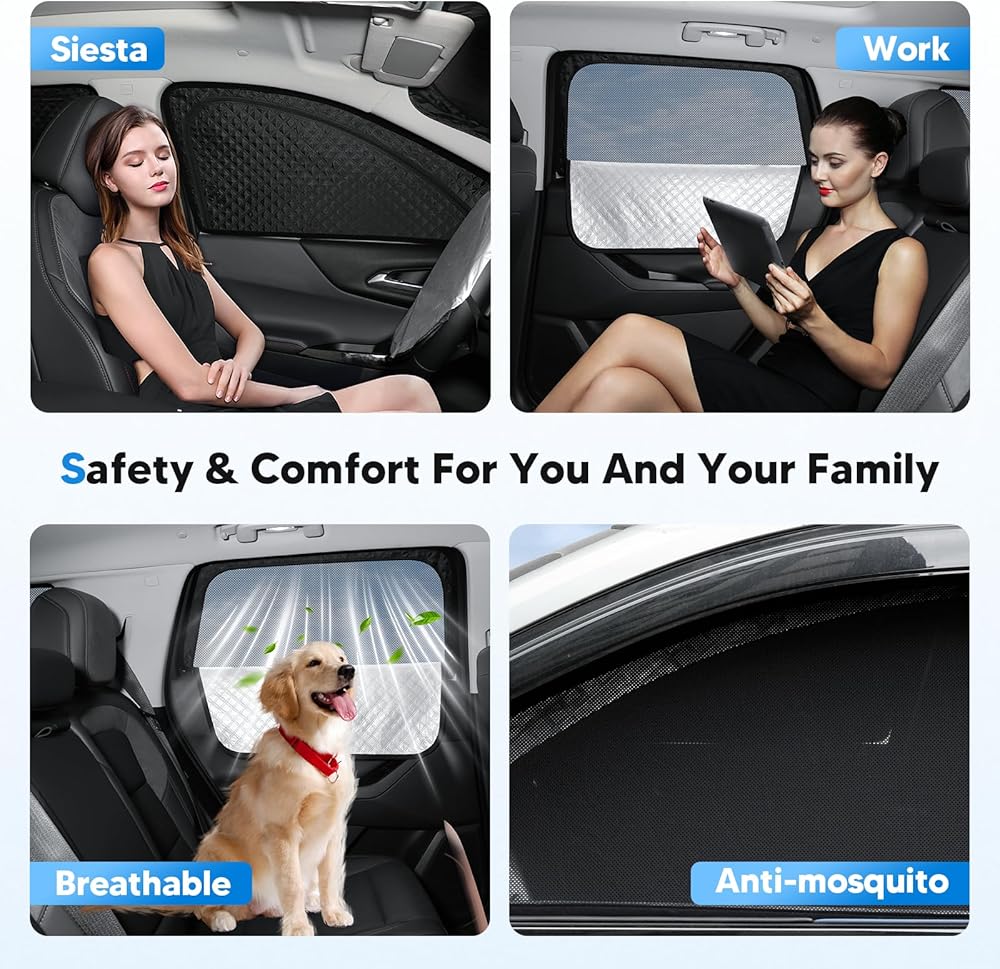 2-in-1 Dual-Layer Design: Our innovative double-layer design combines sun protection and breathability. The sun visor keeps your back seat cool and lowers the overall interior temperature, while the mesh layer allows airflow and blocks mosquitoes. Simply unzip to switch between sun protection and ventilation modes, so you can enjoy a refreshing breeze during your travels.