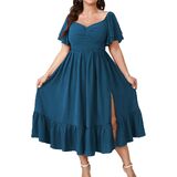 Romantic & feminine design: This stunning plus size maxi dress features double-layer ruffle short sleeves, adding a graceful touch to your look. The sweetheart neckline enhances femininity, making it effortlessly romantic and flattering, the smocked back ensures flexibility, ruffled dress with side slit creates a dreamy and flowy effect when you walk, this plus size dress offers a timeless, graceful silhouette