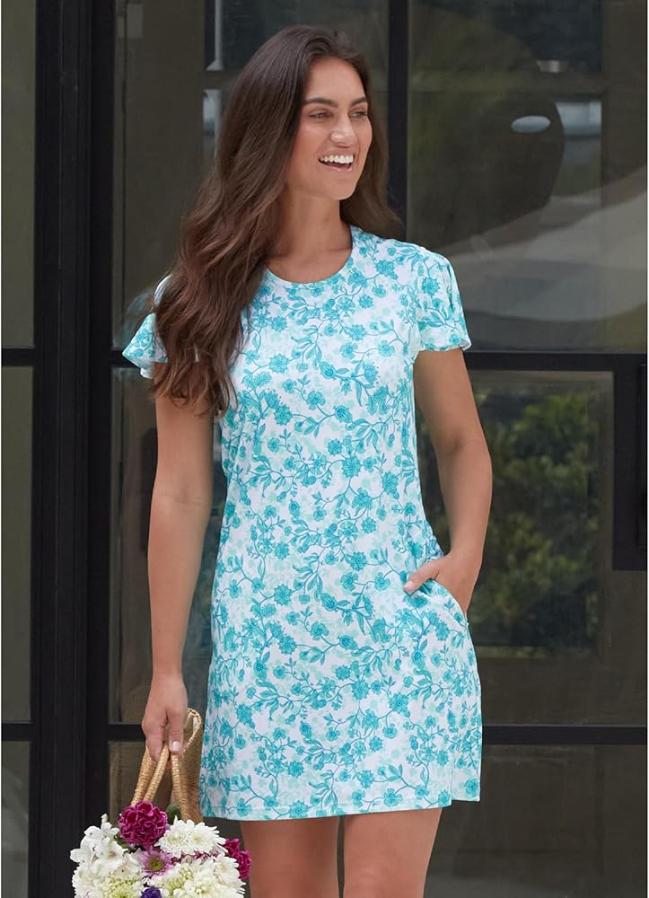 Perfect for resort wear and beach outfits, this feminine shift dress features delicate flutter sleeves and a vibrant pink and coral tile print, making it a standout piece in your 2025 vacation wardrobe